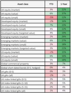 We were reminded of the benefits of diversification with some of our tilts – to Emerging Markets and Value stocks performing well. Portfolios as a whole saw good returns over longer periods.