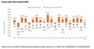As an example from last year, the black diamond shows that at the time of President Trump introducing global tariffs, global stockmarkets fell by 18% at their lowest point. But then recovered and the orange bar shows the market finished the year 14% higher than it started.