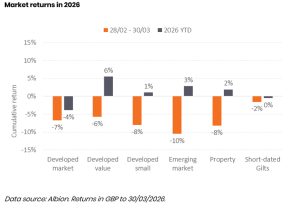 The table below shows the performance of a number of asset classes in 2026 so far and the return over the last year as at close of play on Monday 30 March 2026.