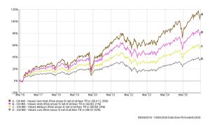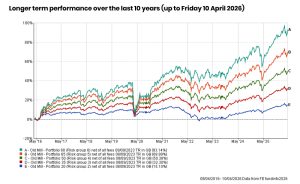 The values portfolios have only been available to our investors for the last five years, but the graph below shows the longer time frame of ten years showing the potential upside over longer periods.