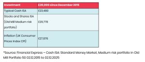 The table below looks at the last ten years and shows the difference between holding money in a Cash ISA against the return from an Old Mill medium risk portfolio and inflation over that period.