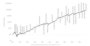 The chart below shows the resilience of stock markets and their upward path, overlaid with some of the challenges that the world has faced over time.