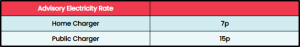 The Advisory Electricity Rate for fully electric cars is below. Electricity is not a fuel for car fuel benefit purposes.